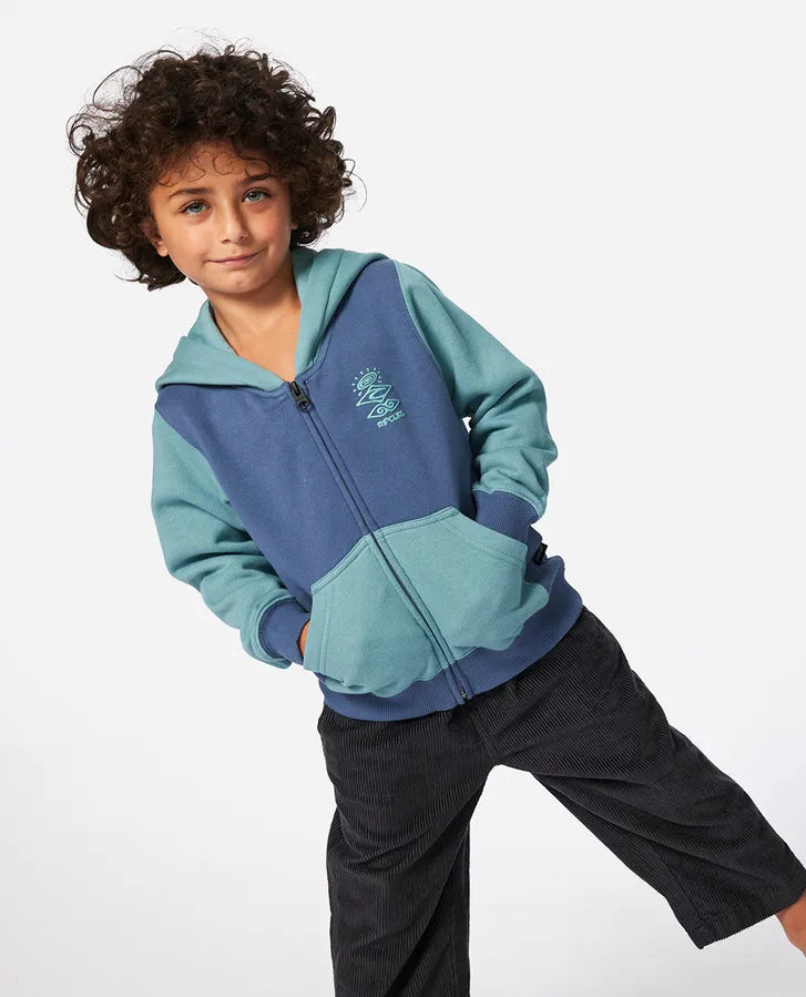 The Grom Energy Zip Through Hood blends comfort and functionality with a front zip, kanga pocket, and front-and-back prints. Perfect for energetic little surfers on the go.