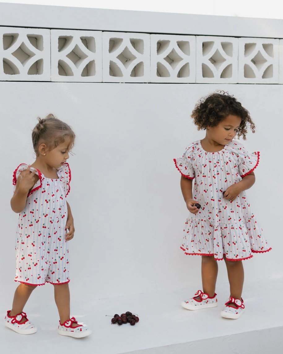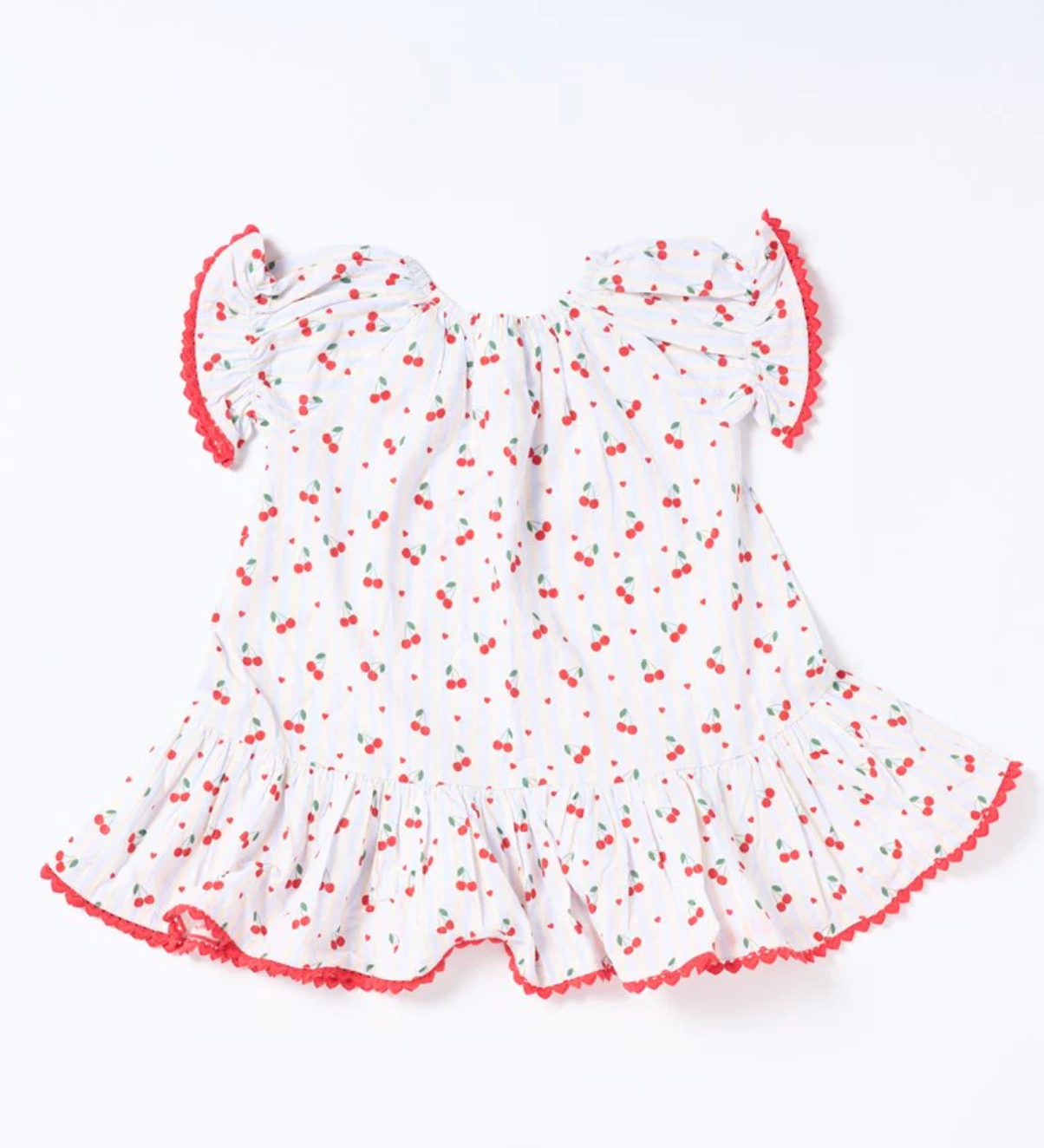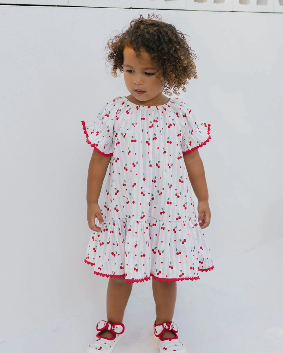 Back by popular demand! The bestselling Alexa Dress returns in its sweetest form yet – Cherry. Featuring a playful cherry print on soft striped cotton, this twirl-worthy silhouette is finished with flutter sleeves, red scalloped trims, and a breezy tiered hem. Easy to slip on and perfect for sunny days, this fan-favourite dress is made for picnics, parties, and everything in between.