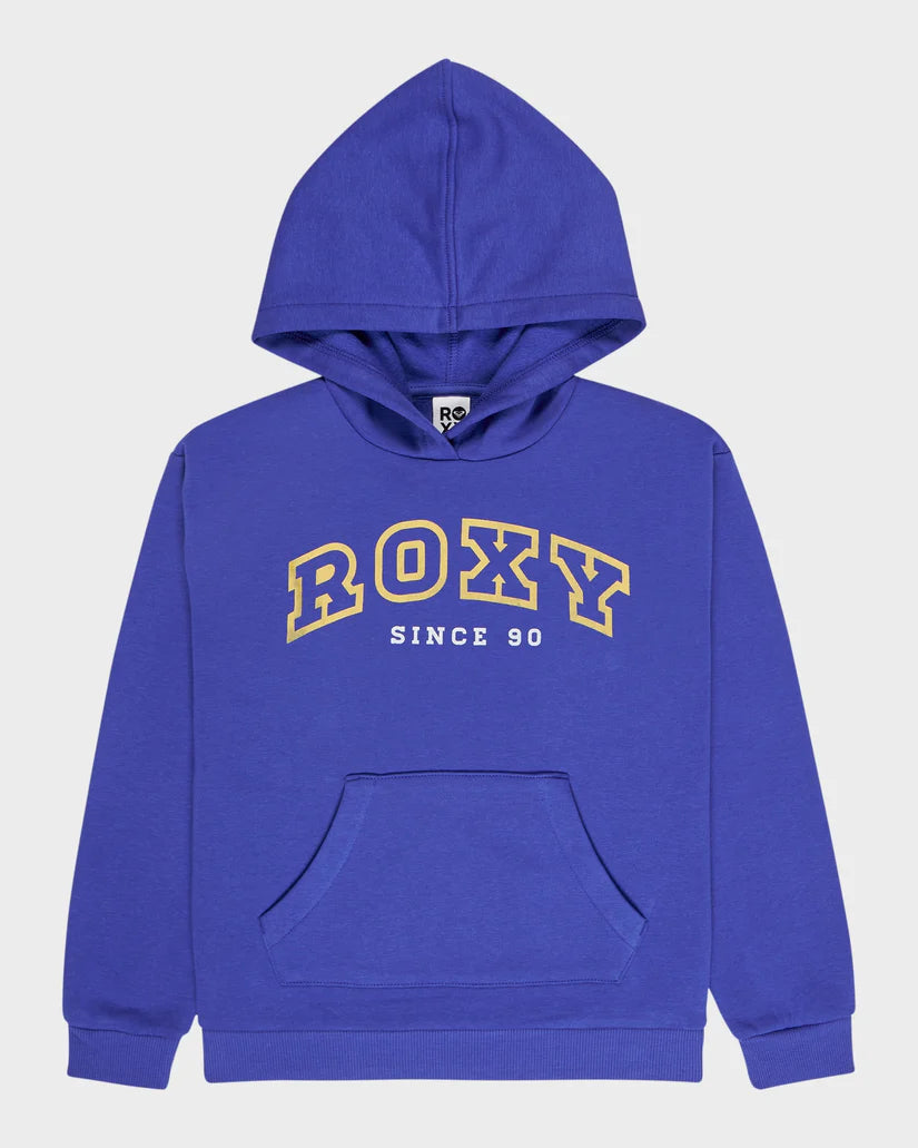 Neck: Hoodie Pouch pocket Roxy art on front and sleeve.