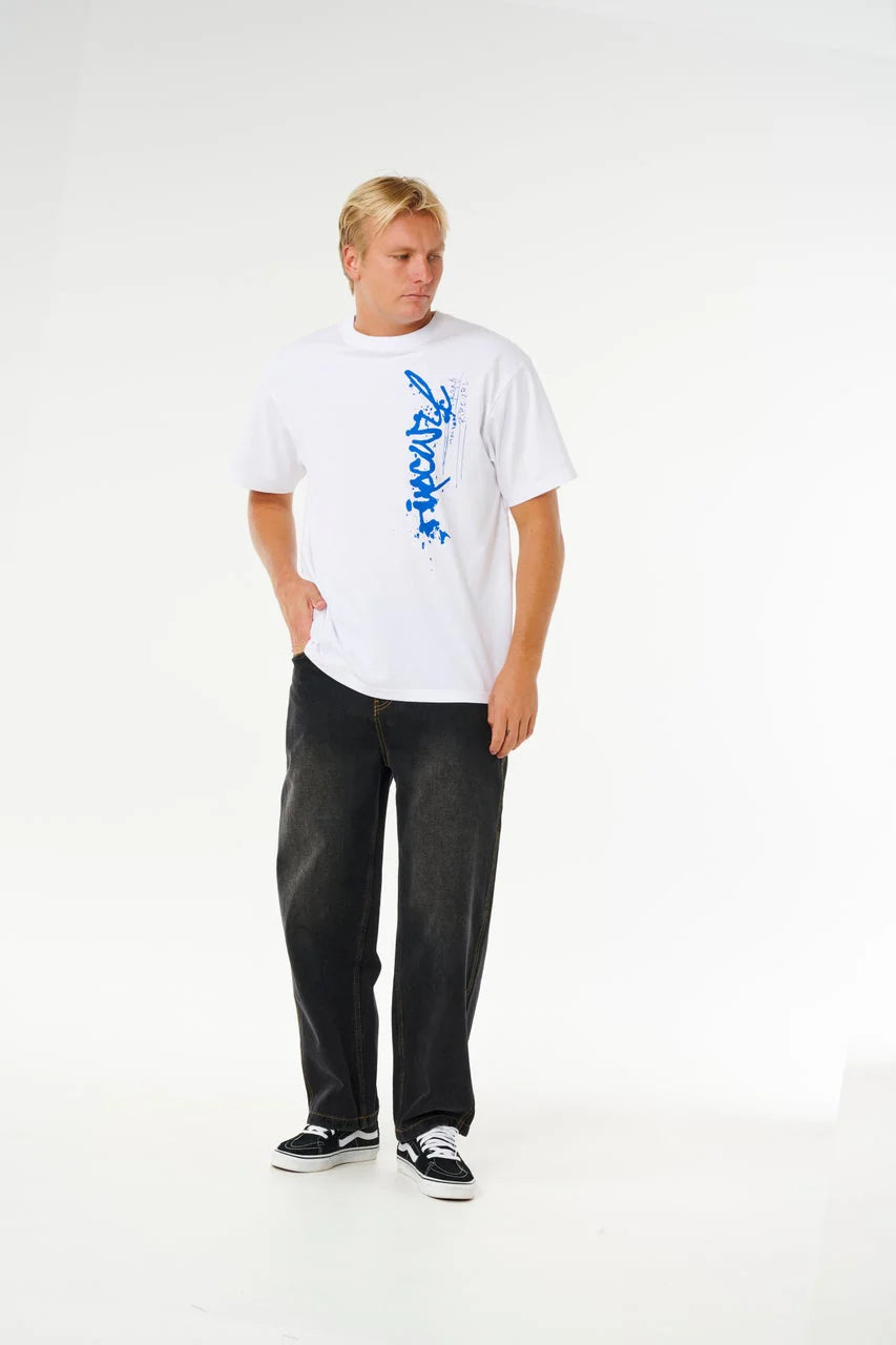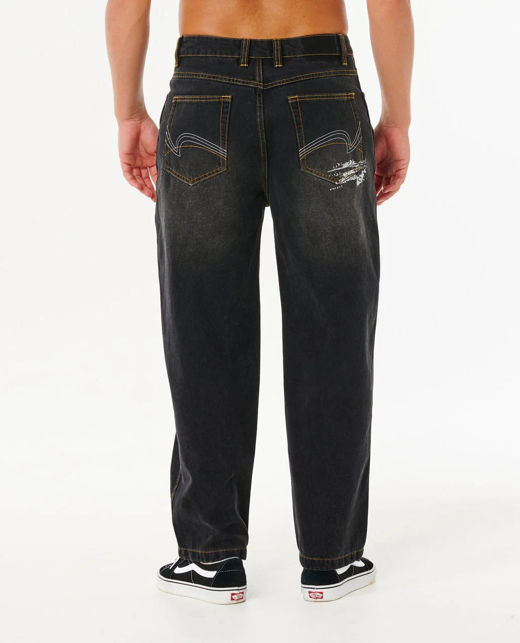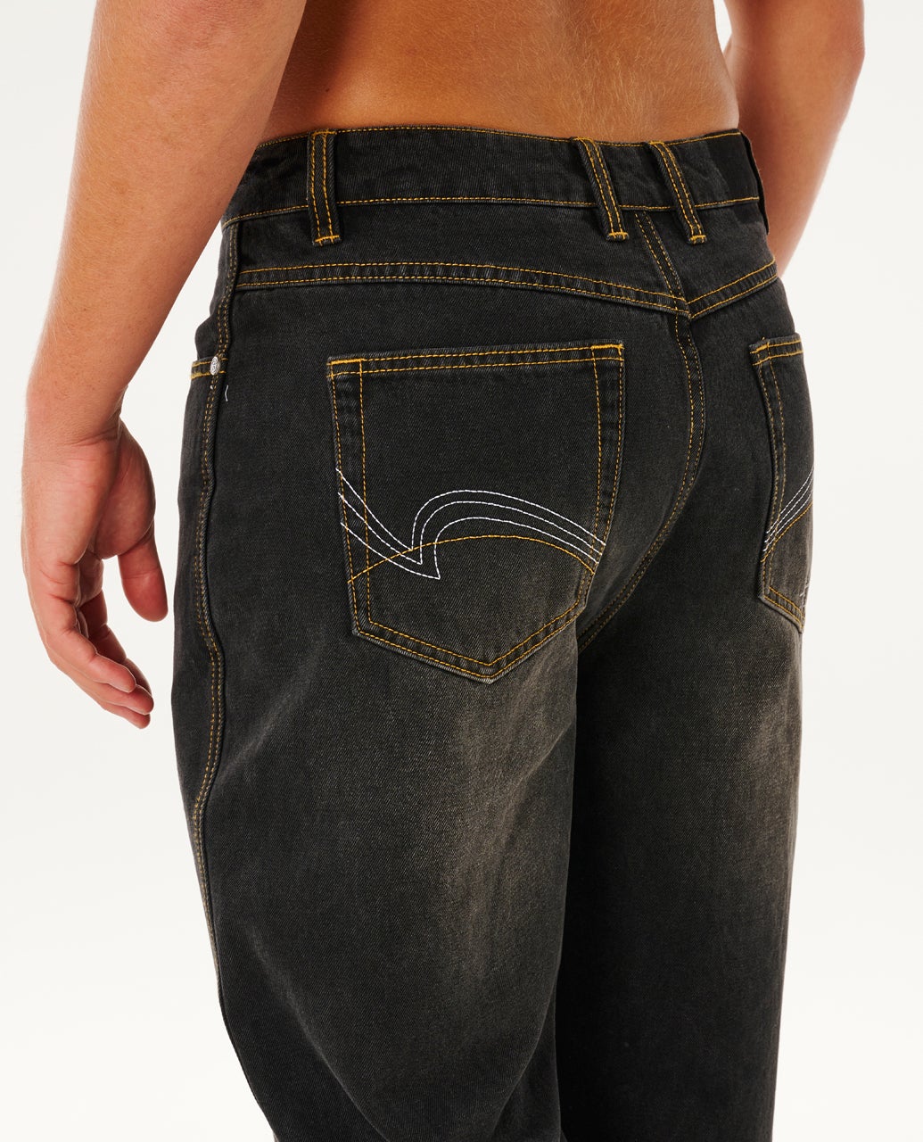 The Inner Visions Denim Pant delivers bold style with a baggy fit and cotton denim construction. Features include contrast stitching, placement print, embroidered logo, and distressed details for a vintage surf look.