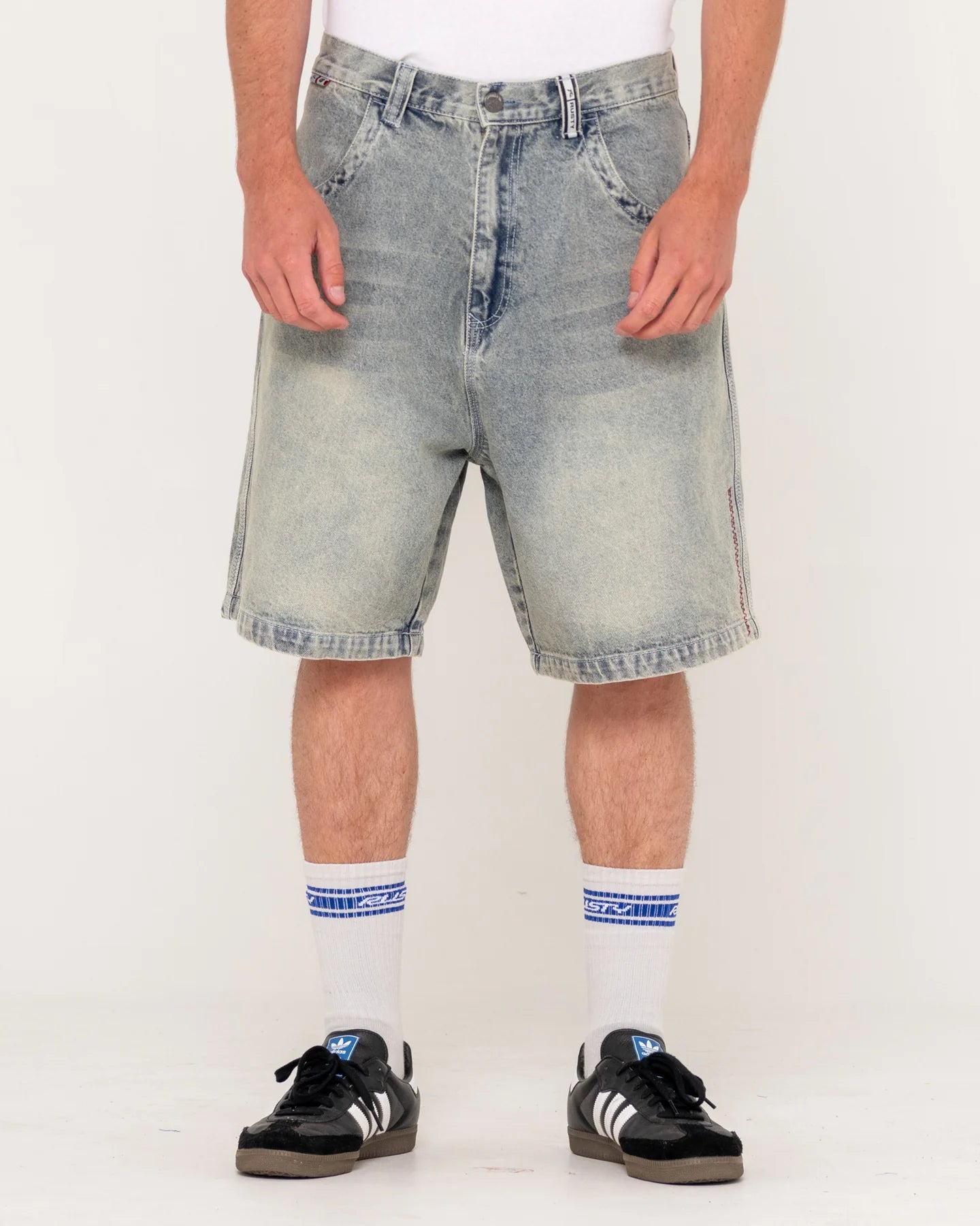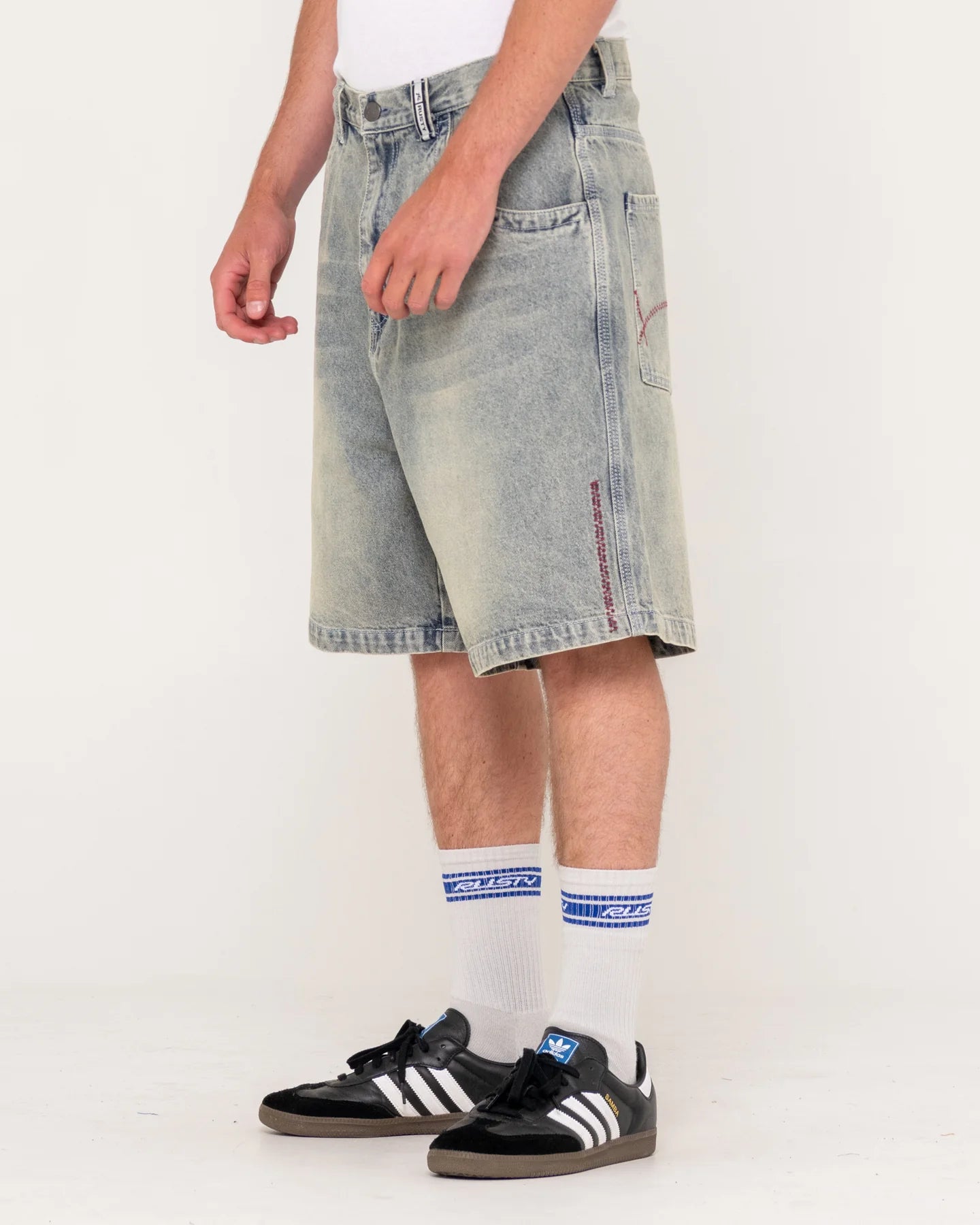 Baggy Fit - 22 Outseam Jort With Rusty Screen Print And Stitch Detailing. 100% Cotton Indigo Denim