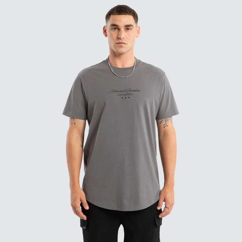 The Juncture Dual Curved Tee in Charcoal offers a slim fit in the body and arms, extending to a long length that ends with a stylish curved hem. Made from a cotton blend, enzyme silicon soft wash.
