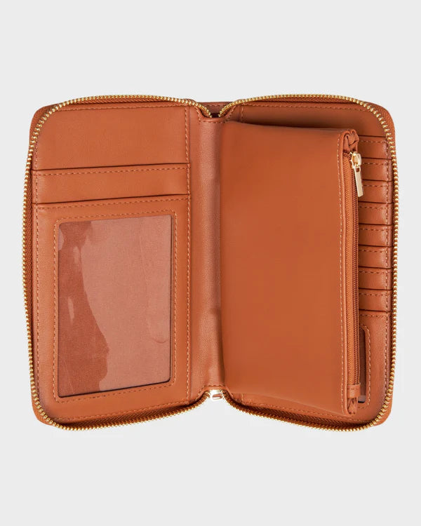 Keep your essentials close with this all-around zip wallet designed for everyday adventures. Features an interior zip pocket for secure storage, multiple card slots, and a transparent ID window for quick access. The metal plate and embossed artwork add a touch of character, while the removable wristlet keeps your hands free when you need them. Compact yet functional at 4.9" H x 7.5" W x 1" D—the perfect size for your pocket or bag.