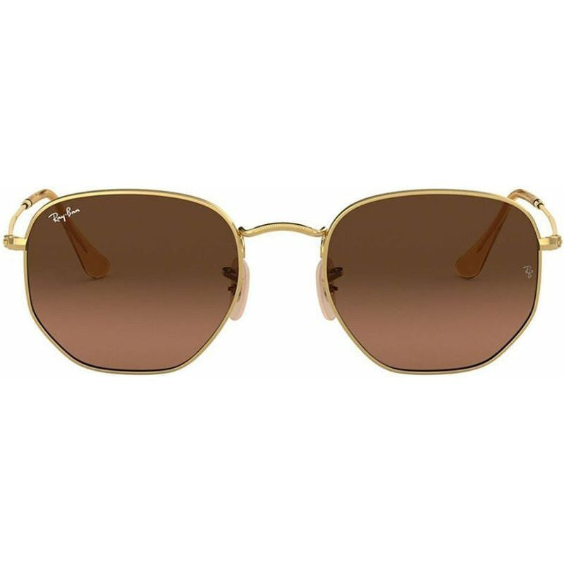 The Ray-Ban Hexagonal Flat RB3548N sunglasses bring a modern twist to minimalist design. Showcasing a striking geometric silhouette, this slender Arista gold metal frame offers a refined finish for the fashion-forward individual. The adjustable nose pads and acetate temple tips ensure a comfortable wearing experience for all-day wearability. Paired with brown gradient glass lenses, the RB3548N sunglasses deliver a calming visual experience while offering high UV protection.