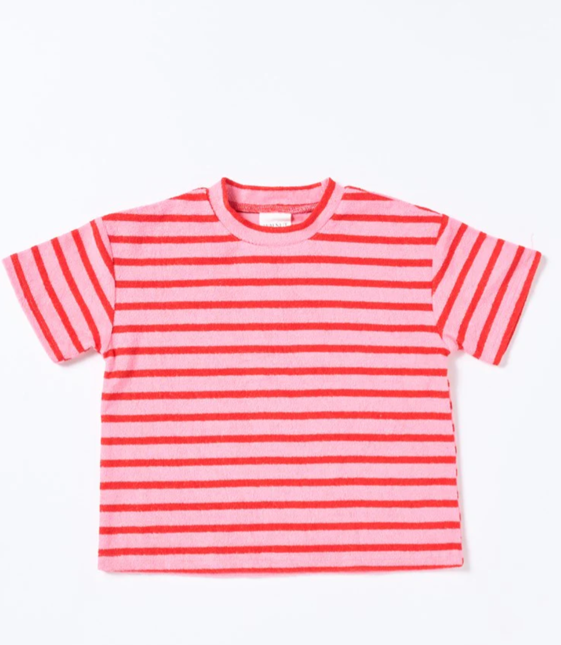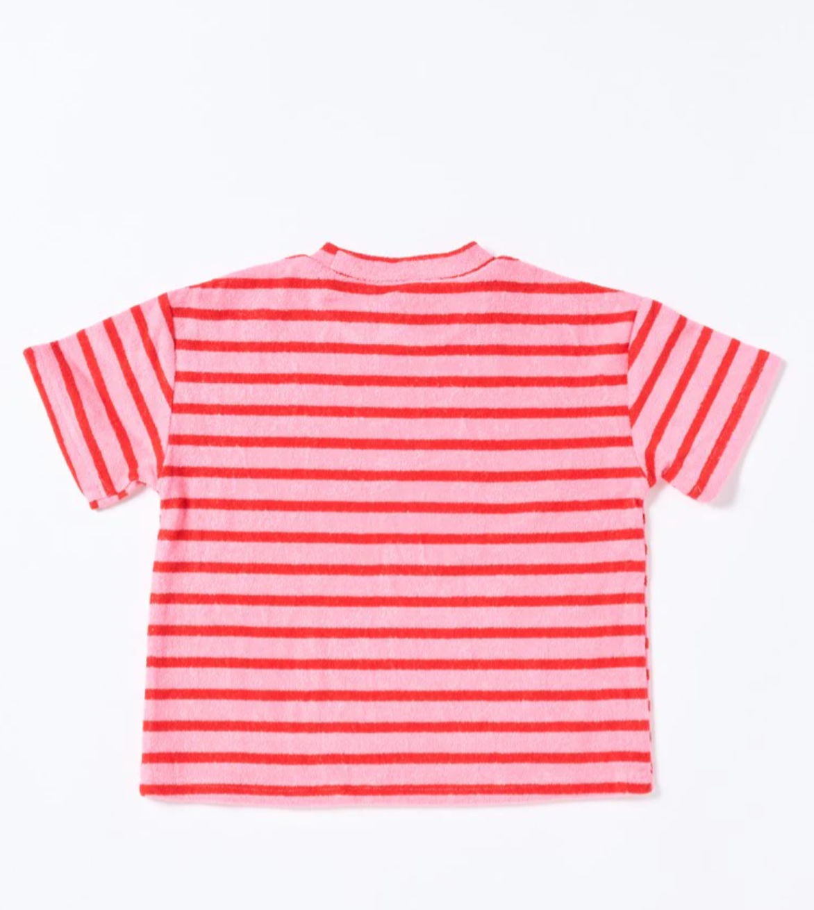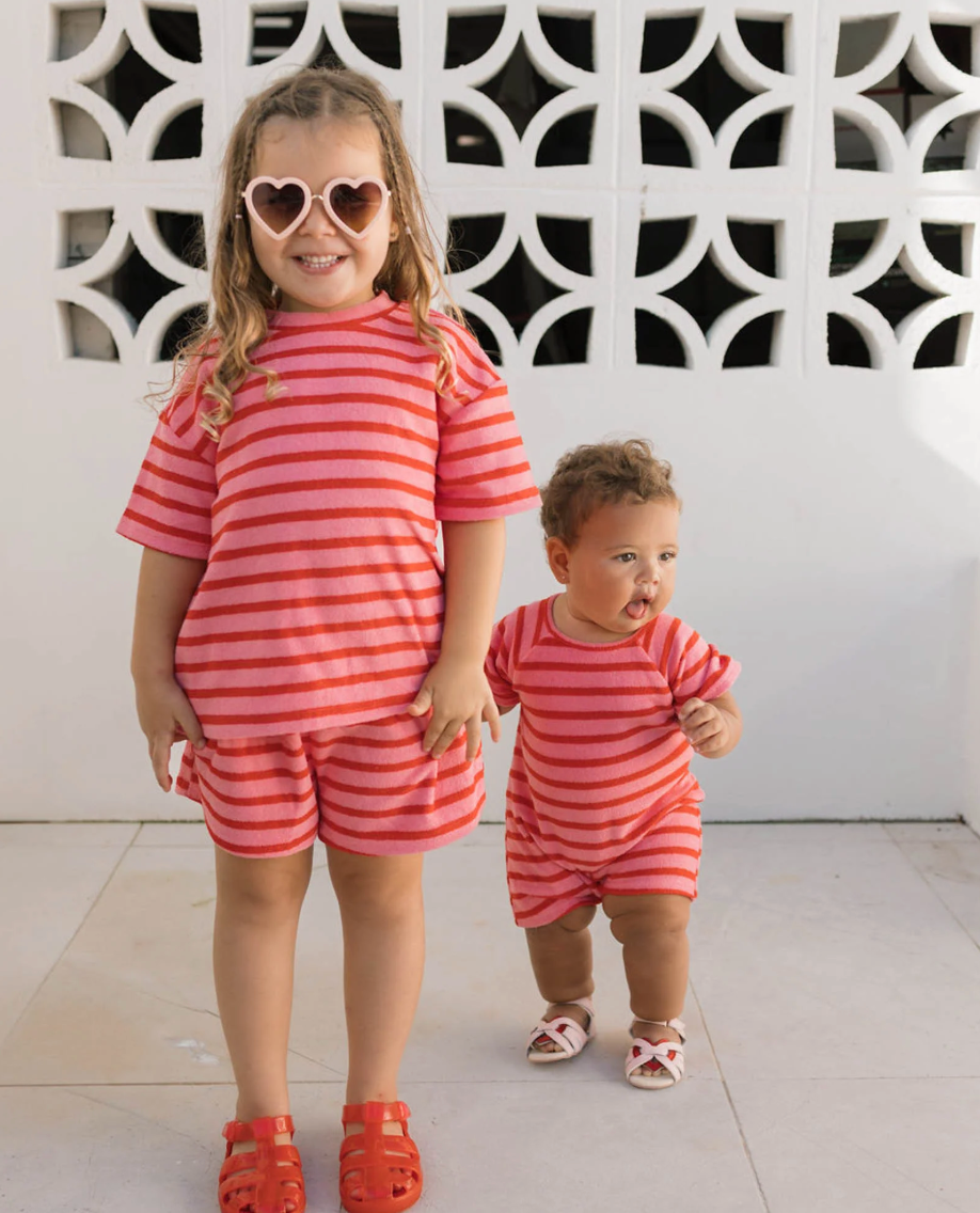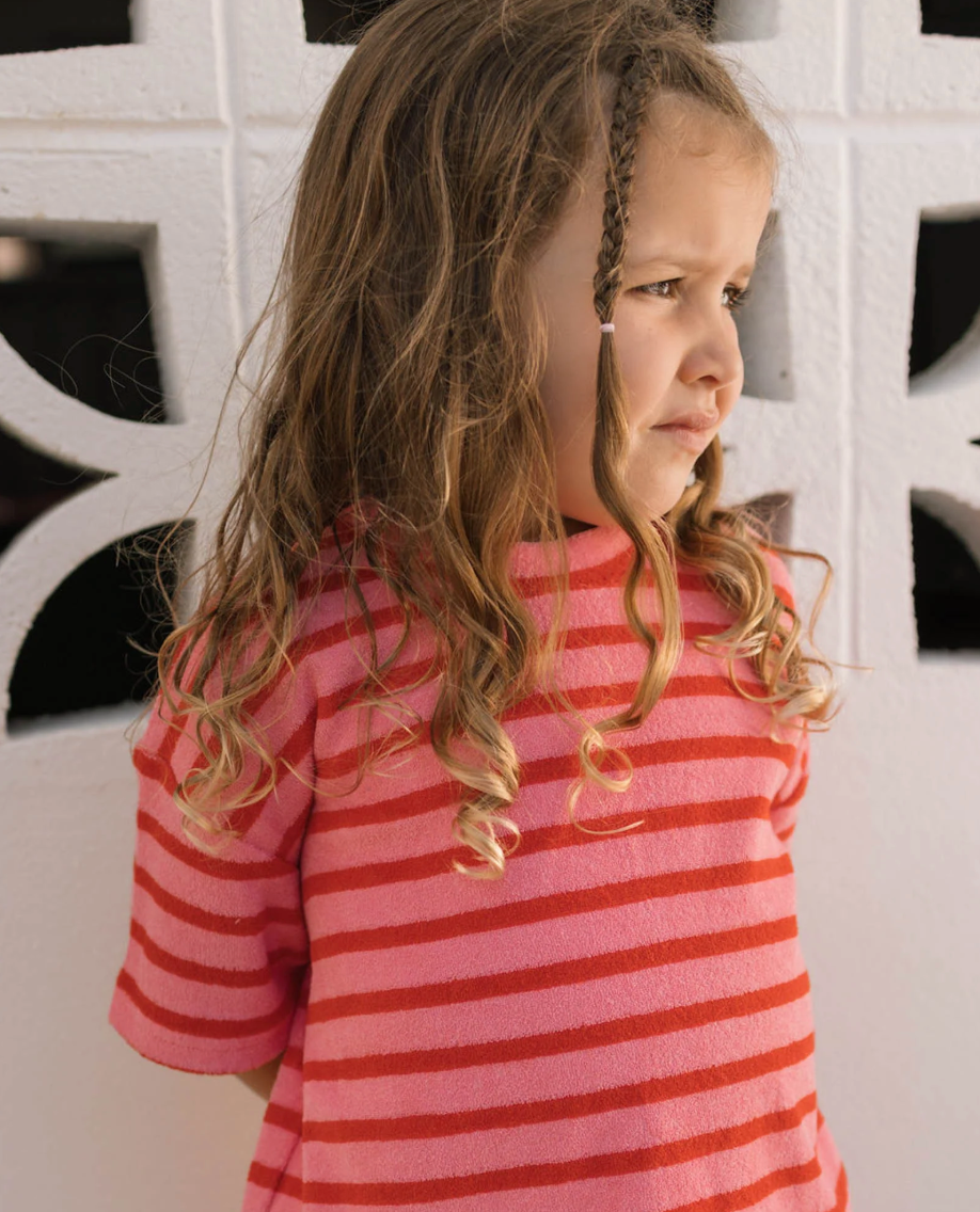 The Felix Tee in Terry Stripe Pink is made from soft terry towelling with bold, candy-coloured stripes. It’s comfy, breathable, and perfect for everyday wear—whether it’s park hangs or beach days. A fun and fresh twist on a classic tee.