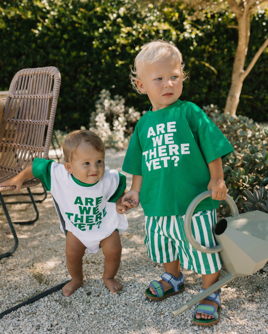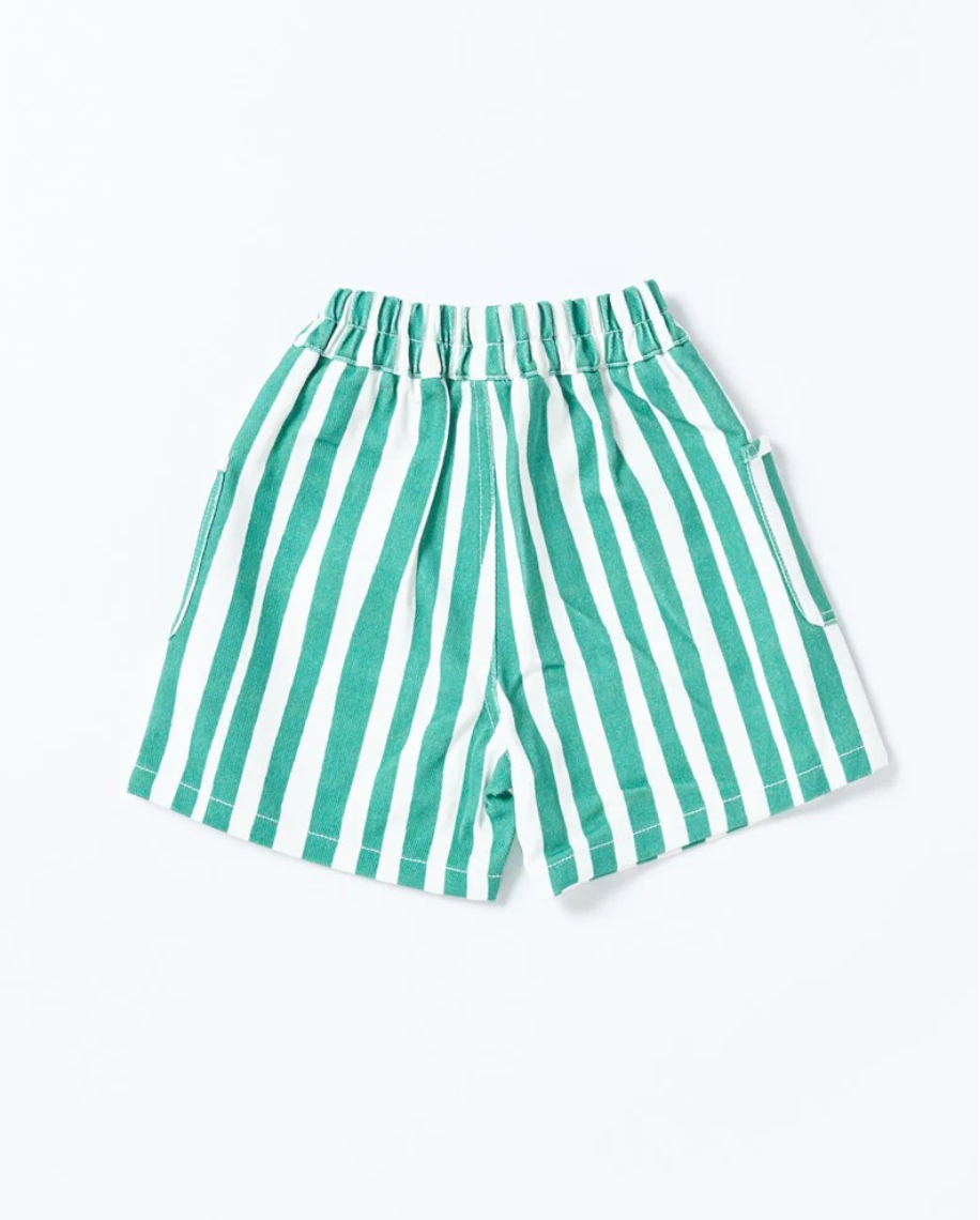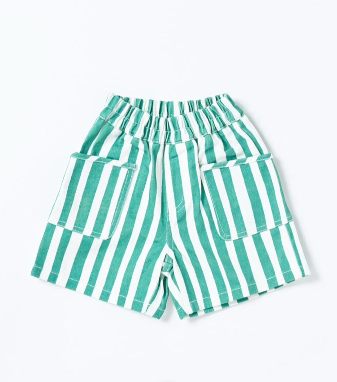 Easy, breezy and built for everyday adventures, the Remy Short in Green Stripe is a fresh take on a summer staple. Featuring bold vertical stripes in a punchy green and crisp white, these cotton shorts are designed with handy patch pockets and an elastic waistband for a comfy, fuss-free fit. Perfect for playful days in the sun!