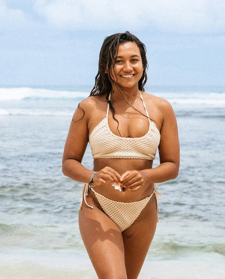 Introducing the Indio Skimpy Coverage Bikini Bottoms crafted with Hand Crochet. Fully lined, hand-made with functional side tie detail, offering skimpy coverage, these bikini bottoms combine style with attention to detail for a chic beach look.