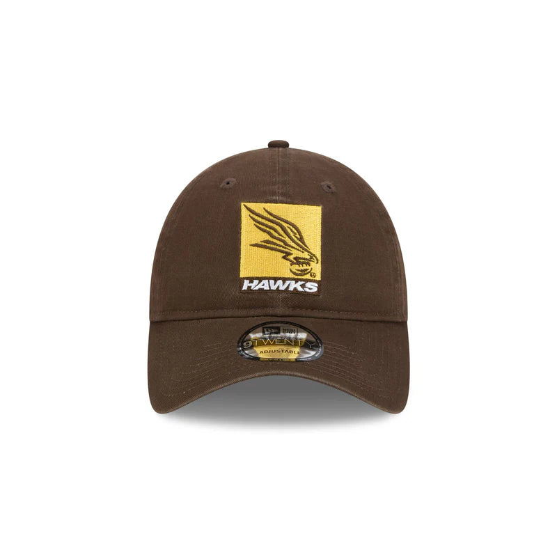 The Hawthorn Hawks AFL Supporter Retro Washed 9TWENTY Cloth Strap features an embroidered flat Hawks retro logo on a low-profile unstructured cotton crown, a NE Flag logo on the left, and an adjustable cloth strap enclosure.