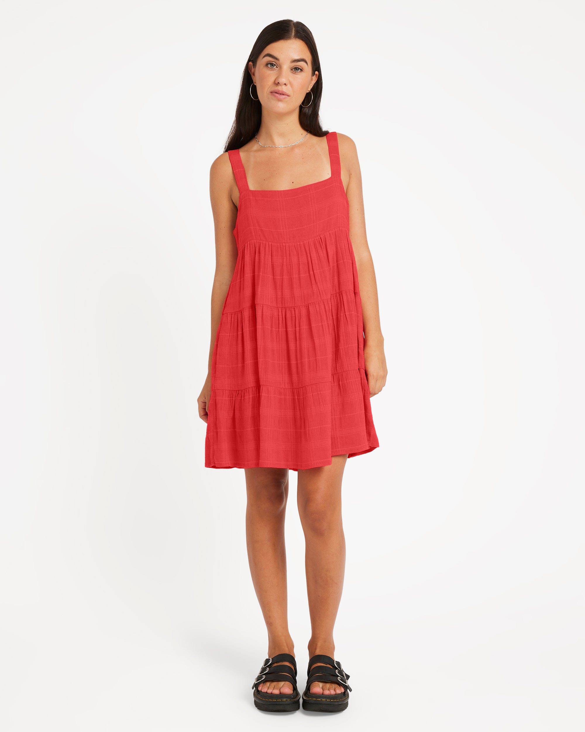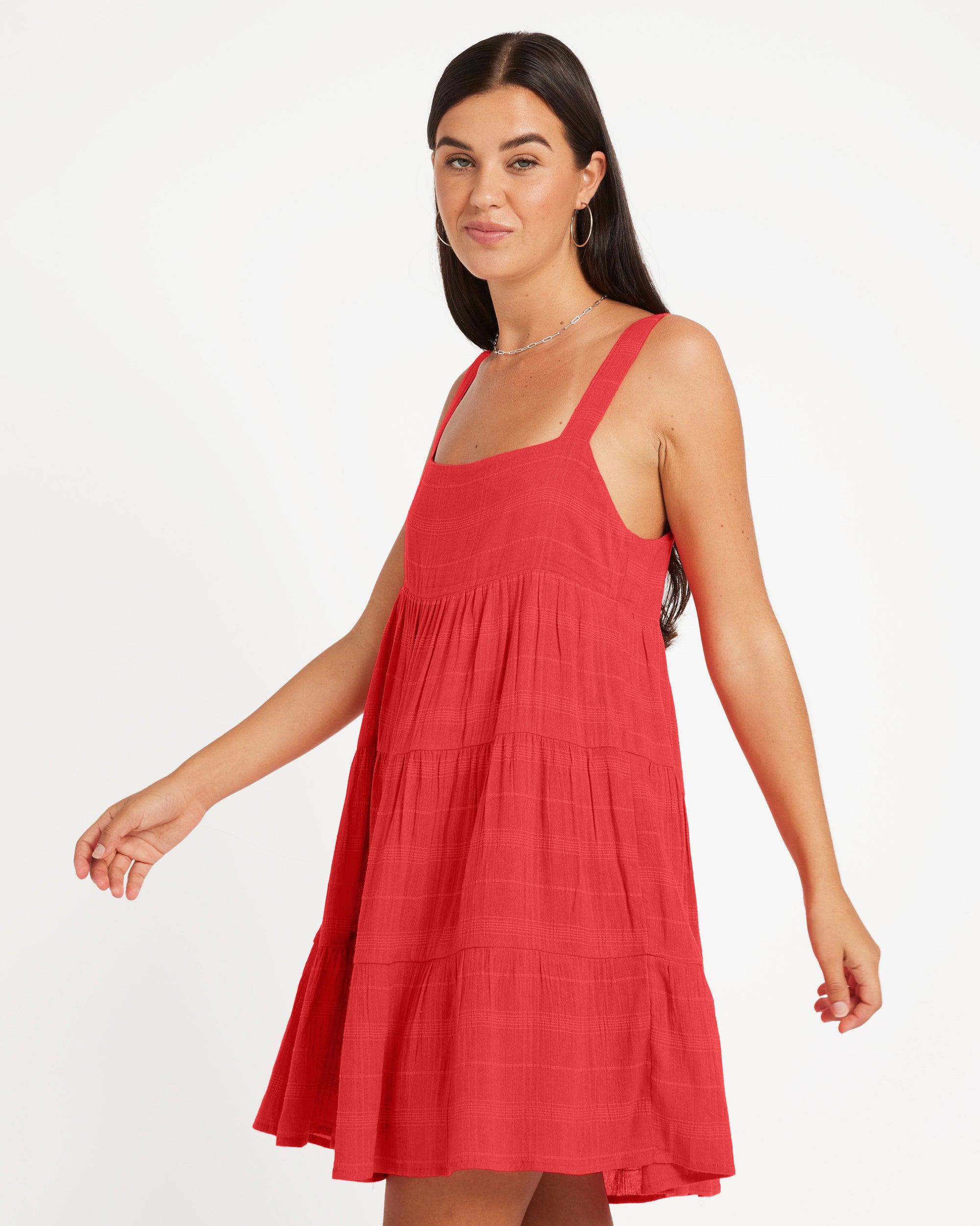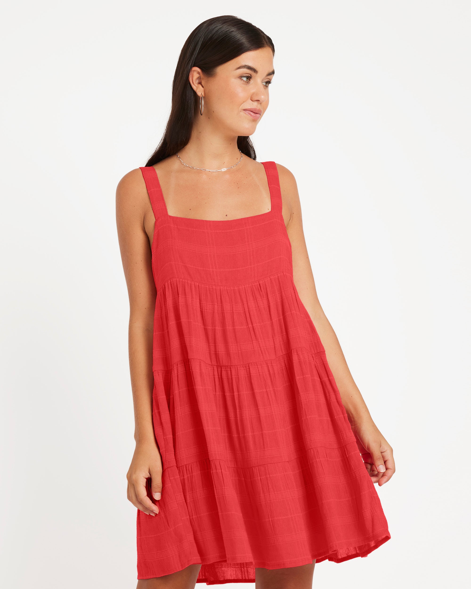 Effortlessly chic viscose dobby mini with loose, tiered silhouette. Fully lined with adjustable wide straps and flattering square neckline. Metal back badge adds subtle branded detail. Easy, feminine style with breathable fabric and relaxed fit.