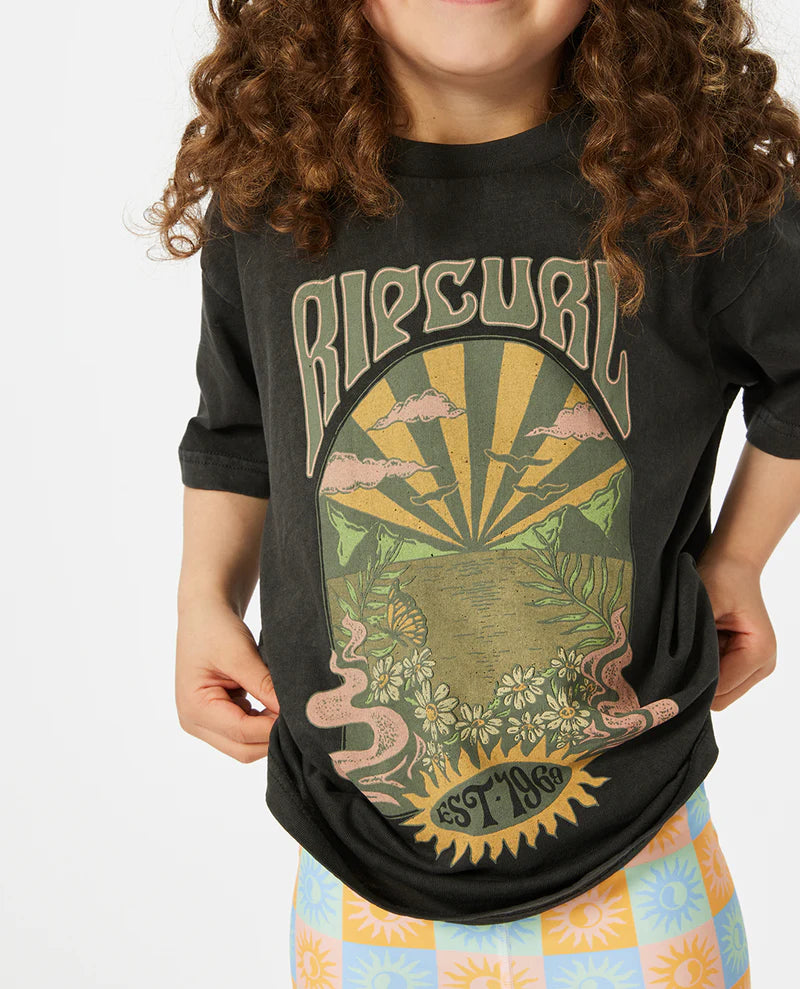 Celebrate summer style with this Rip Curl girls tee featuring Ty Williams' iconic artwork. The washed black finish gives it that effortlessly cool, lived-in vibe perfect for beach days and casual adventures. Soft, comfortable, and packed with artistic flair, it's the ultimate wardrobe essential for young surfers and art lovers alike.