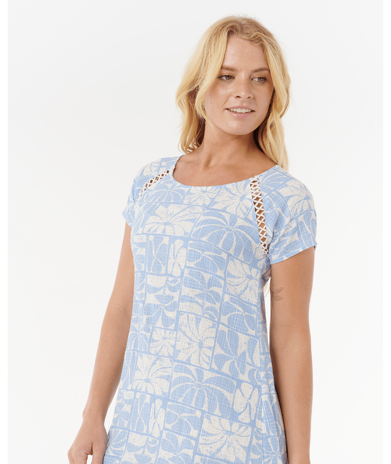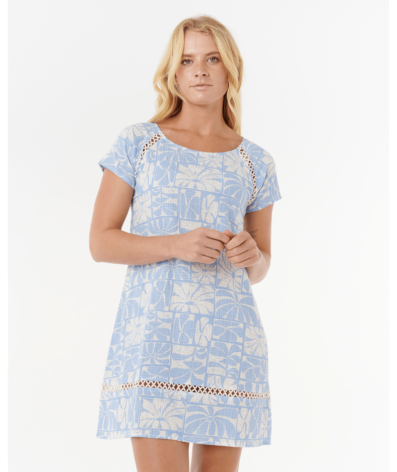 The Artist Of The Search - Ty Williams Shift Dress combines a cotton and Lenzing™ Ecovero™ viscose blend with a softener wash for softness and durability. Featuring an all-over yardage print, crochet trim detail, and metal logo trim, it radiates relaxed bohemian surf style.