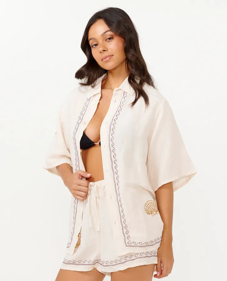 The Beach Party Embroidered Shirt blends 52% linen and 48% viscose, featuring garment wash, engineered hem embroidery, and a metal logo trim.