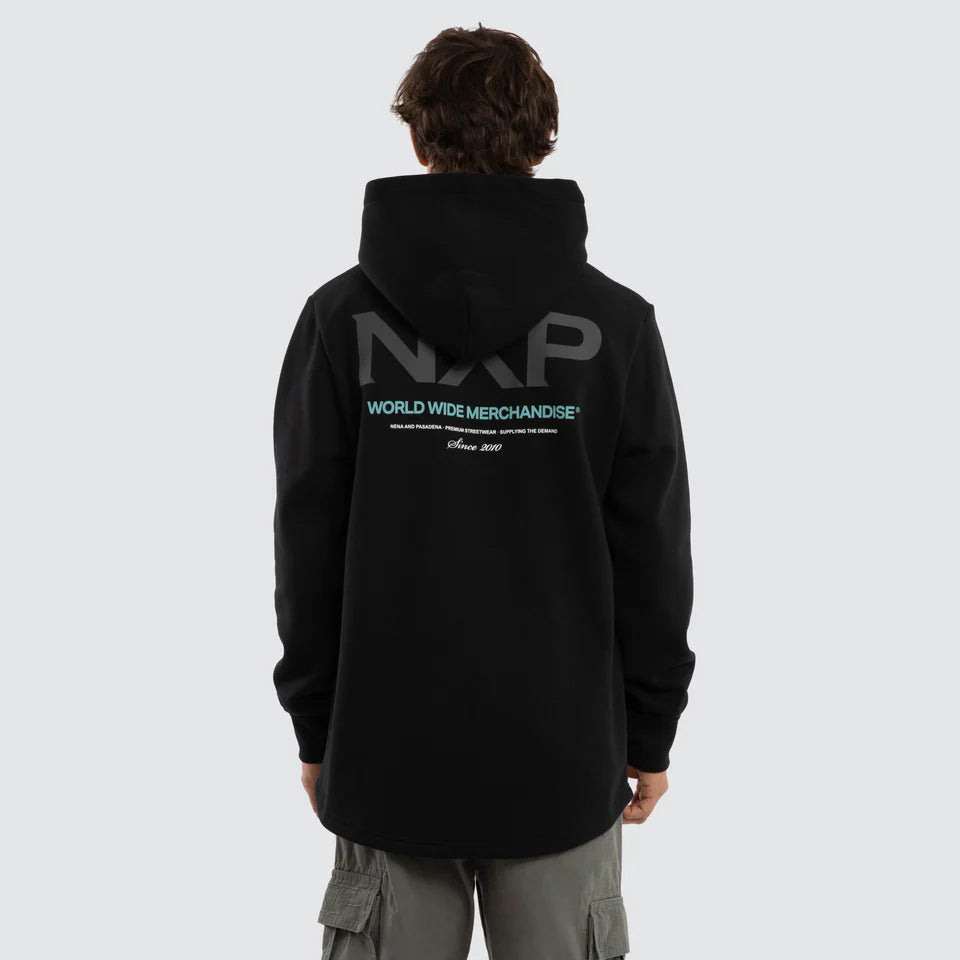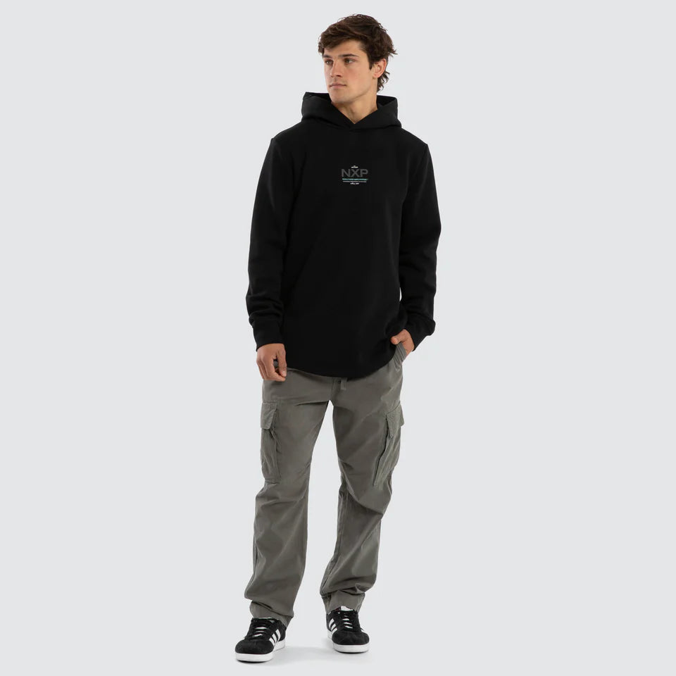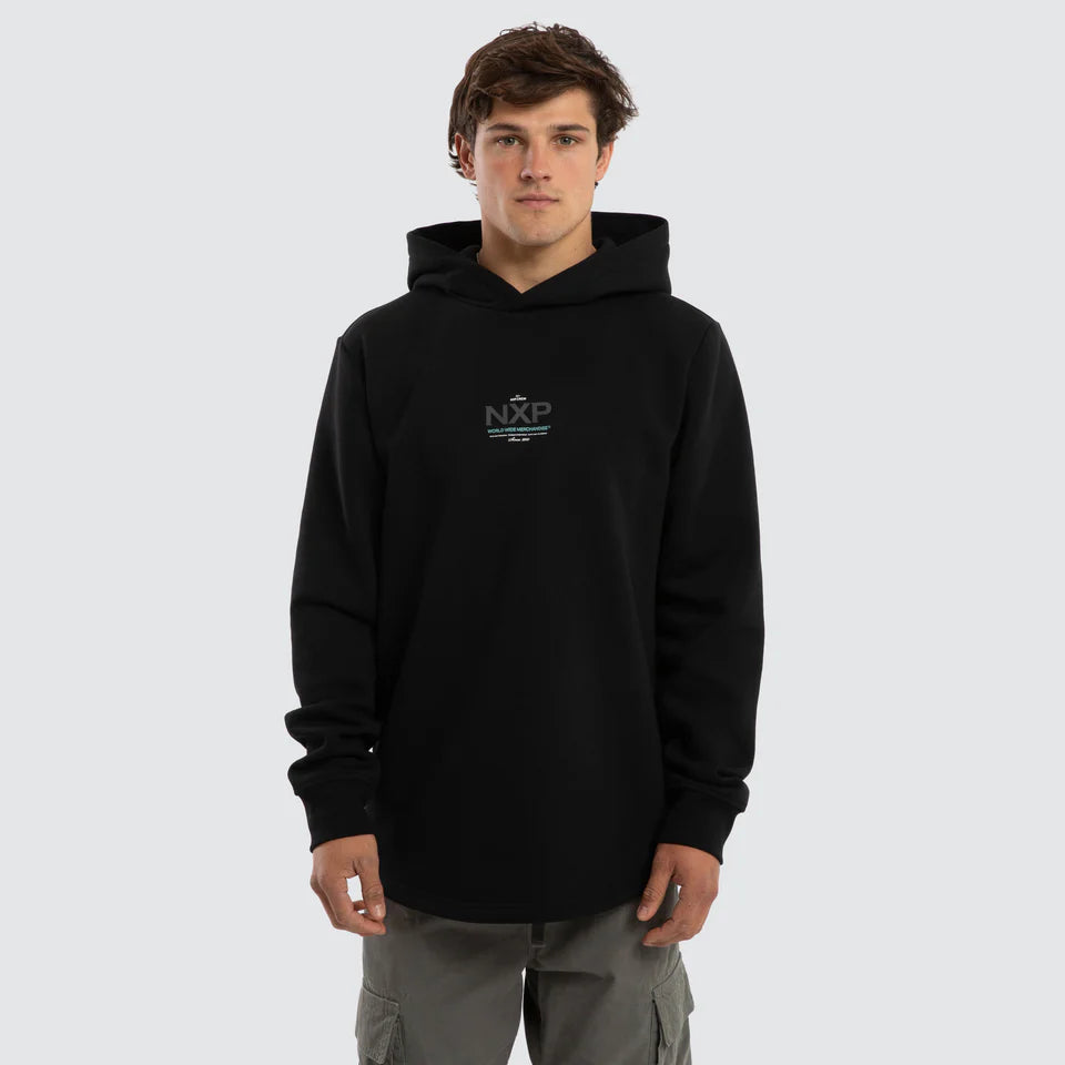 The Peak Dual Curved Hoodie in Jet Black features a slim fit in the body and arms, with a long length ending in a curved hem. Crafted from a blend of cotton and polyester, made for comfort and durability.