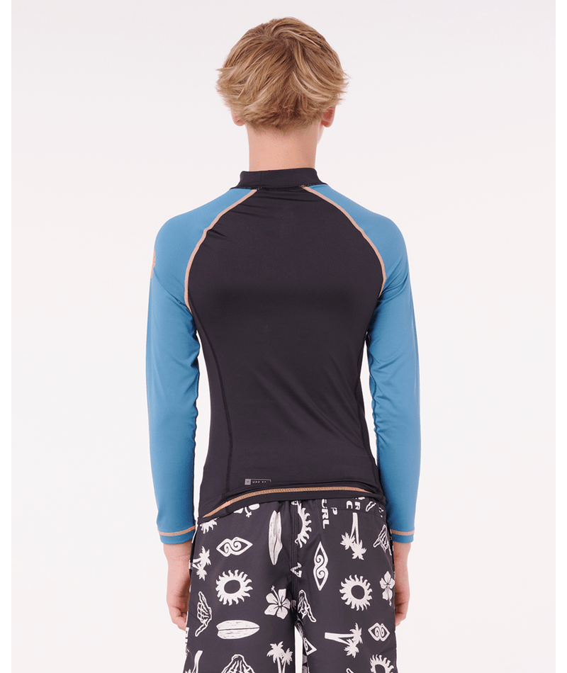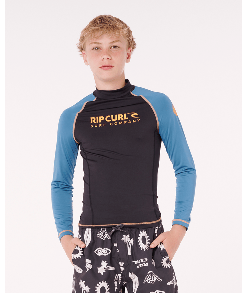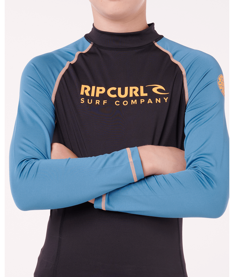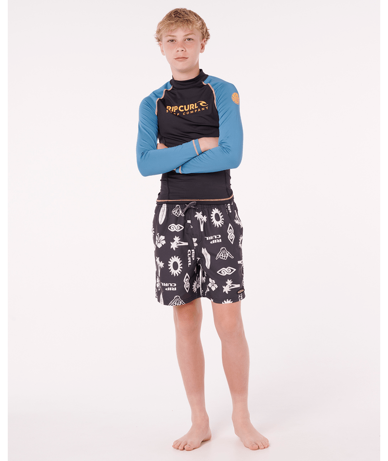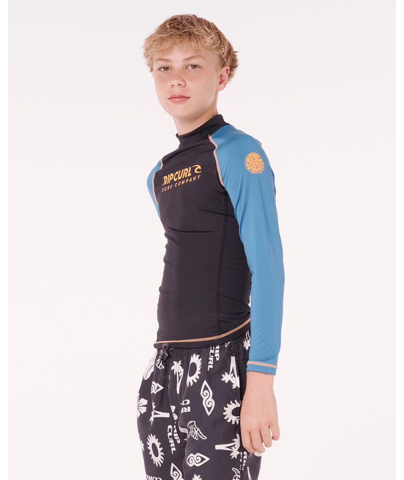 Built for older kids, this performance-fit rash vest combines sun protection with chlorine-friendly fabric and flatlock seams. The elastic boardshort loop and heat transfer graphics make it a reliable choice for serious wave riders.