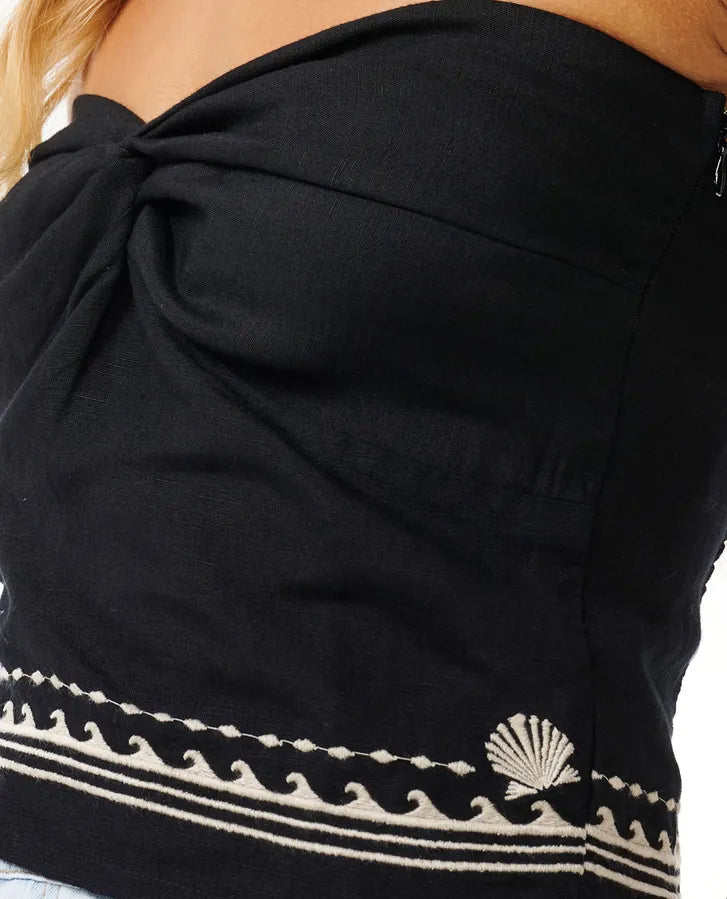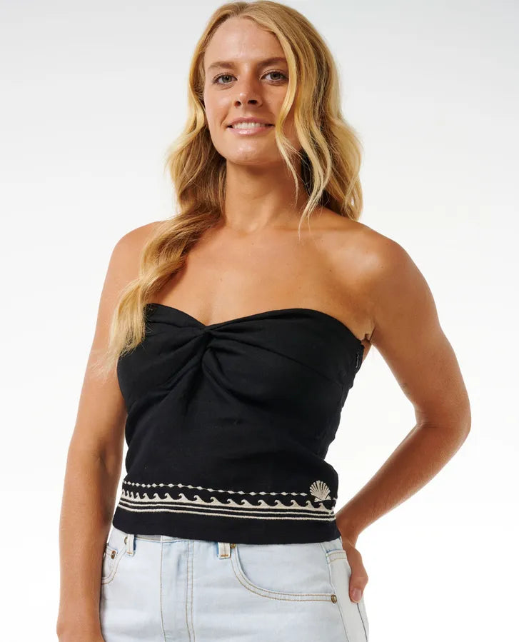 On weekends we wear tube tops and flip flops! This little number is crafted from a soft blend of linen and viscose for the sun chasers and slow, golden days by the water. A subtle twist and statement print is designed
