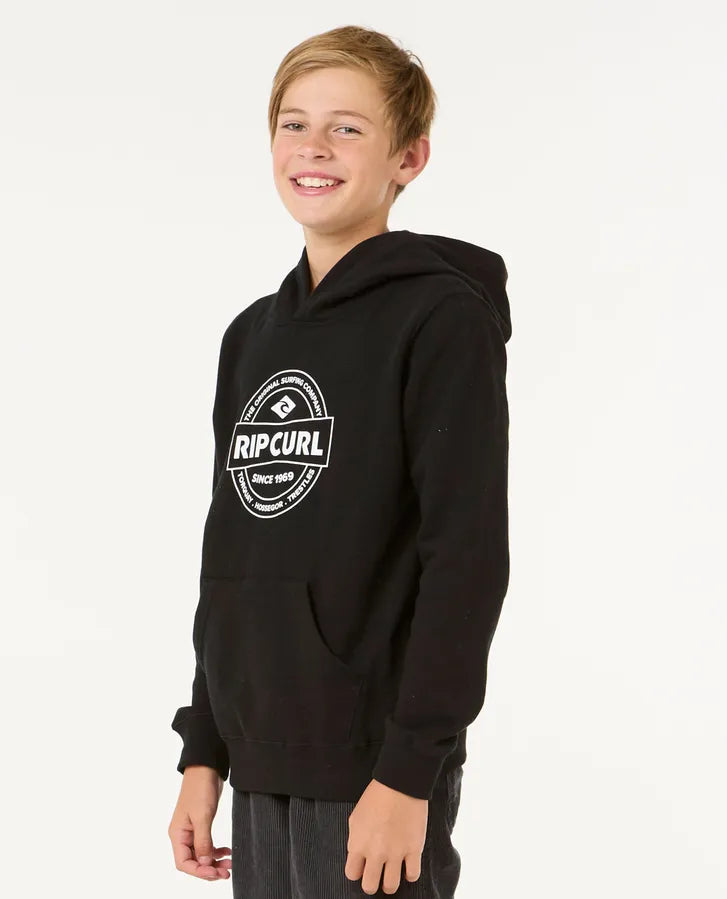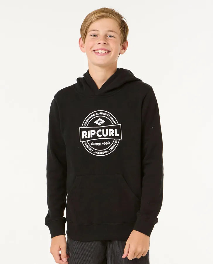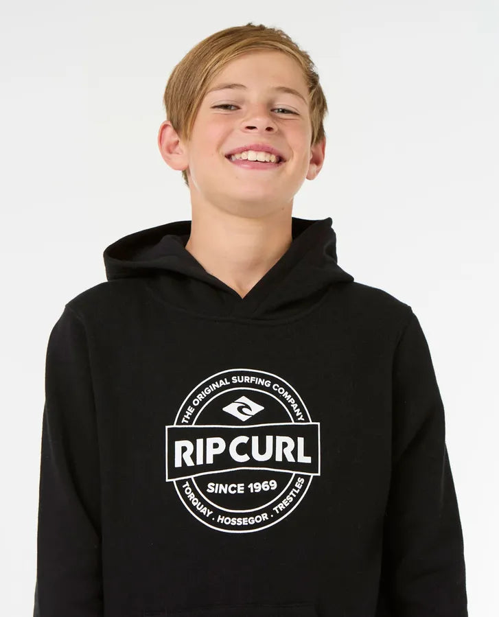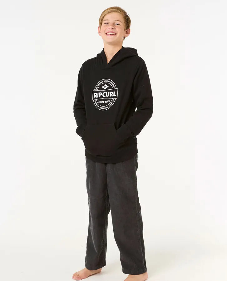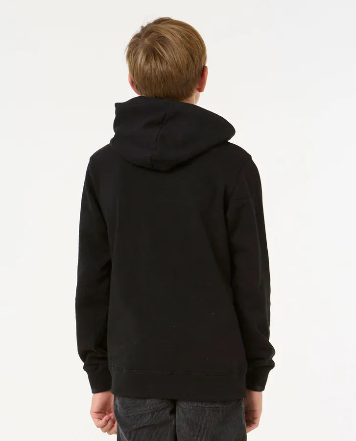 The Stapler Hood for older boys combines a standard fit with a garment wash for extra softness. Featuring a kanga pocket, woven flag label, and front print, it’s a stylish hoodie for active surf enthusiasts.