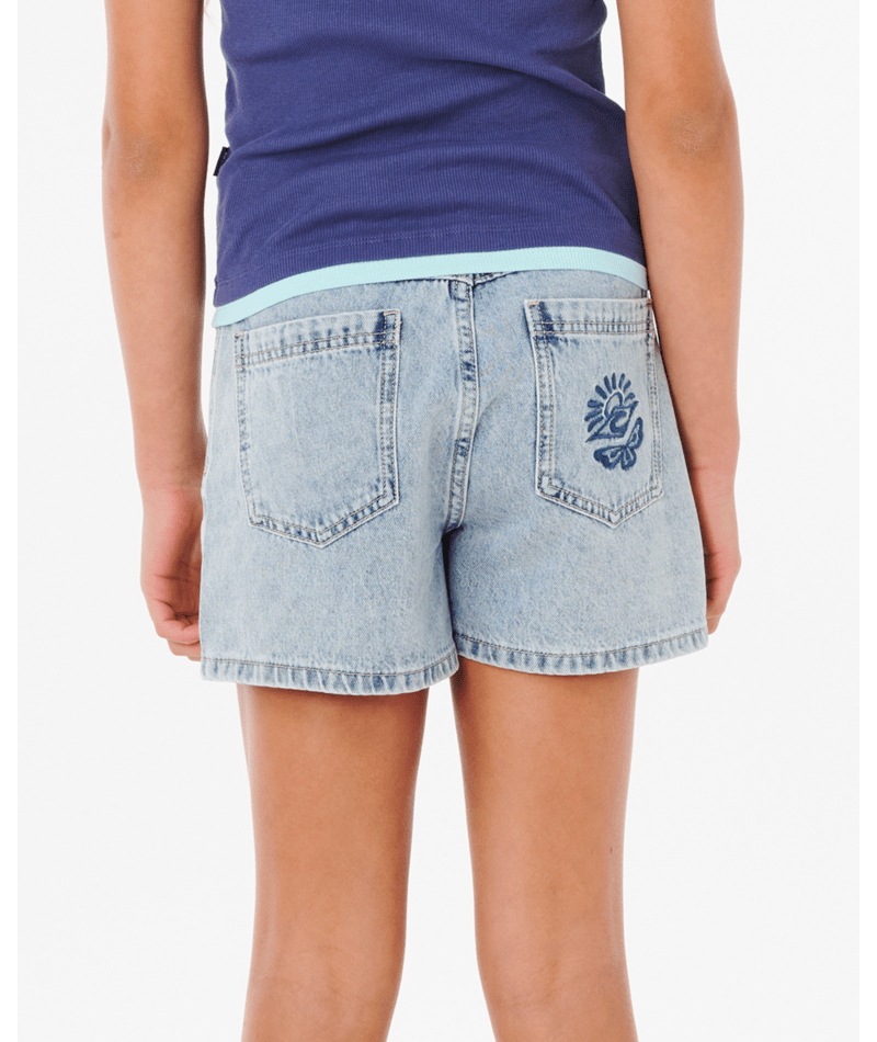 Relaxed fit and heavy enzyme wash give the Tabby Denim Short a lived-in vibe. Adjustable waist detail, metal hardware, and embroidered accents make it a versatile favorite for young surfers hitting the beach or town.